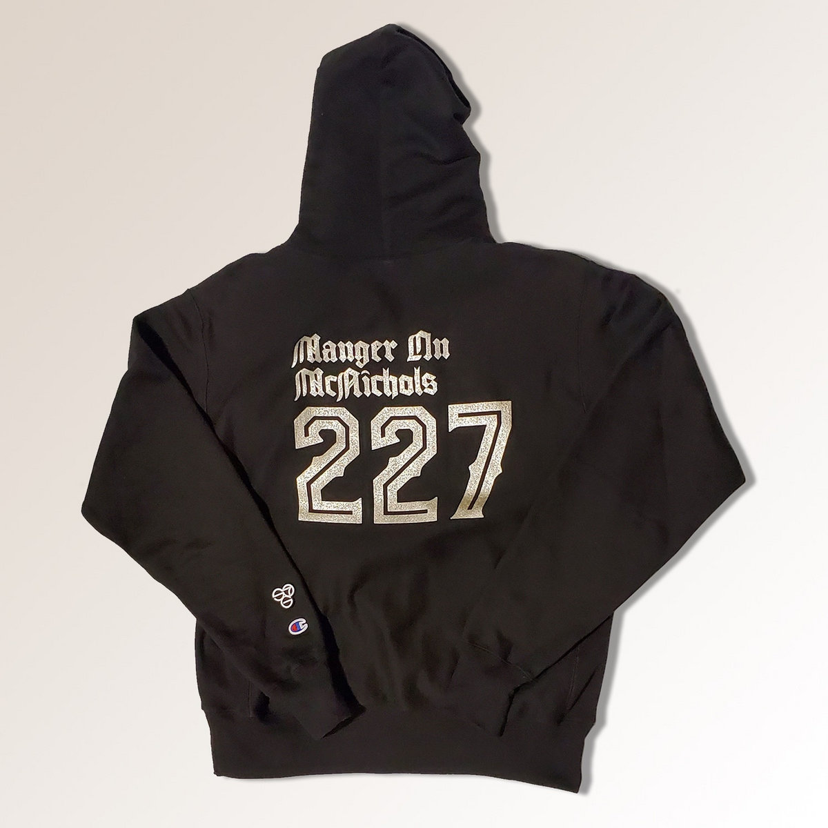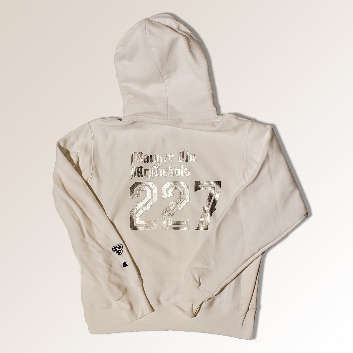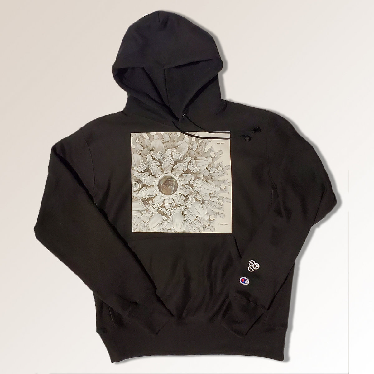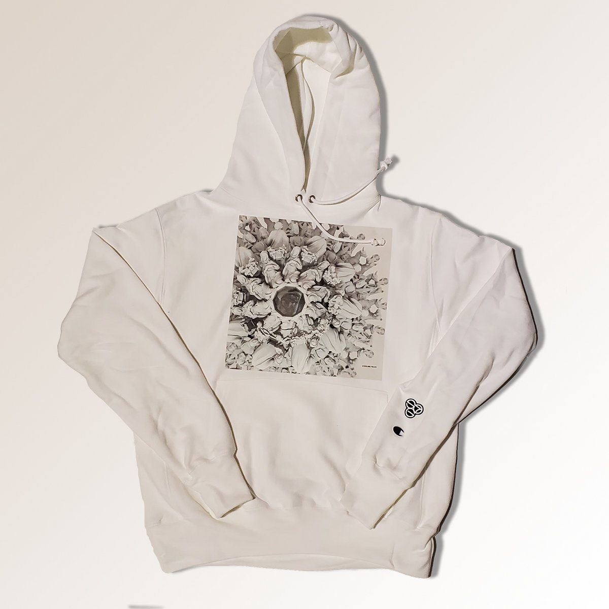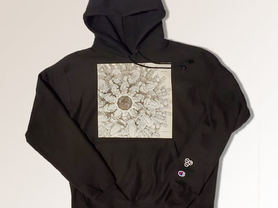 Full color print on front. Silver print on back. S7G logo patch on sleeve. Champion hoodie in black or white.